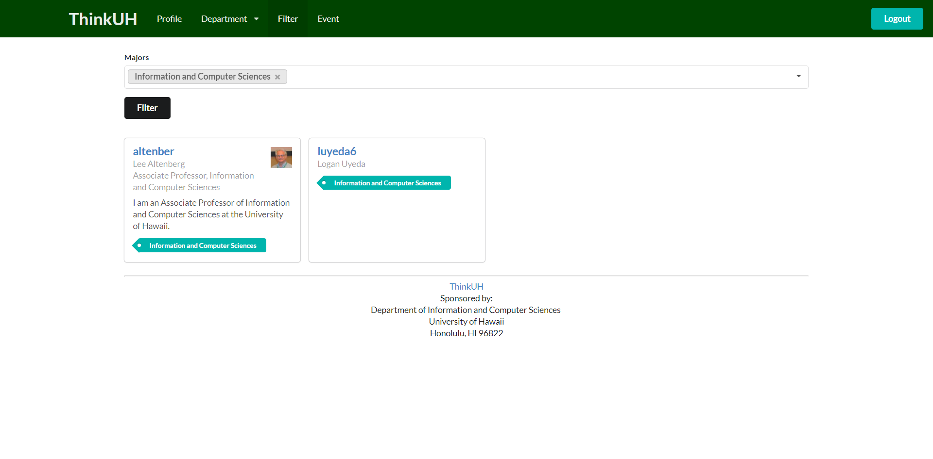 The filter page lets you see the profiles of other people in your major, or of any major you should choose. This way you can see who will be teaching what course, and their attributes and interests.
